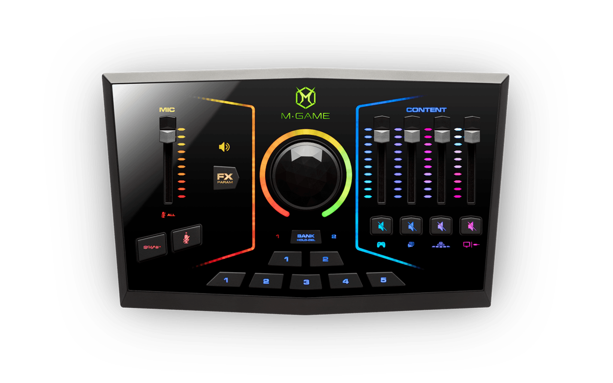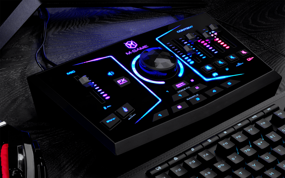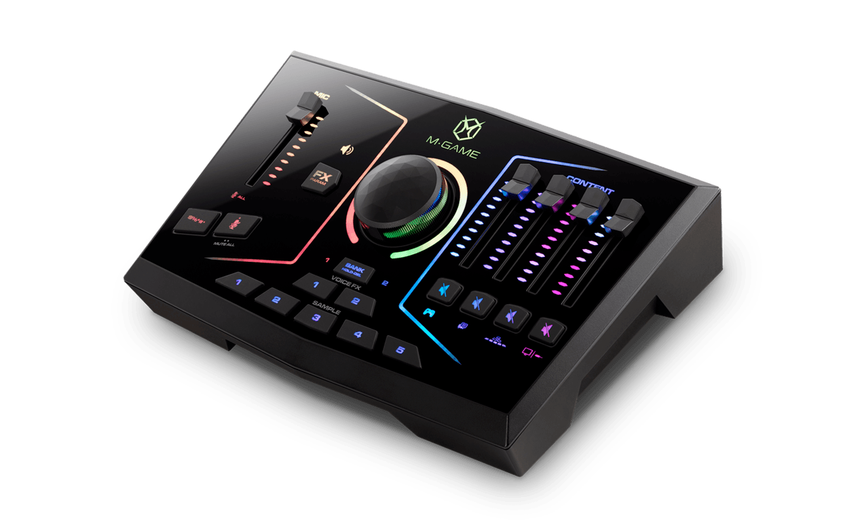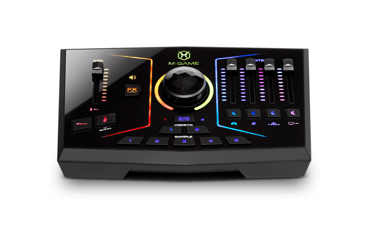M-GAME RGB DUAL is a dual PC USB streaming audio interface/mixer with customizable RGB LED lighting, sampler, and voice shaping and effects combined with a professional audio interface and physical mixing control surface.